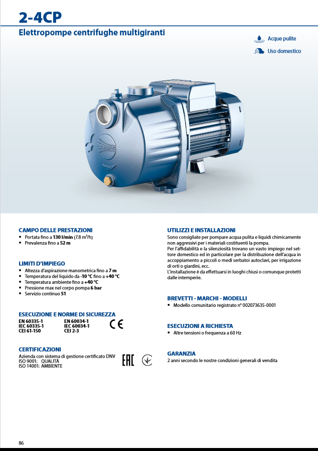 Sono consigliate per pompare acqua pulita e liquidi chimicamente non aggressivi per i materiali costituenti la pompa.