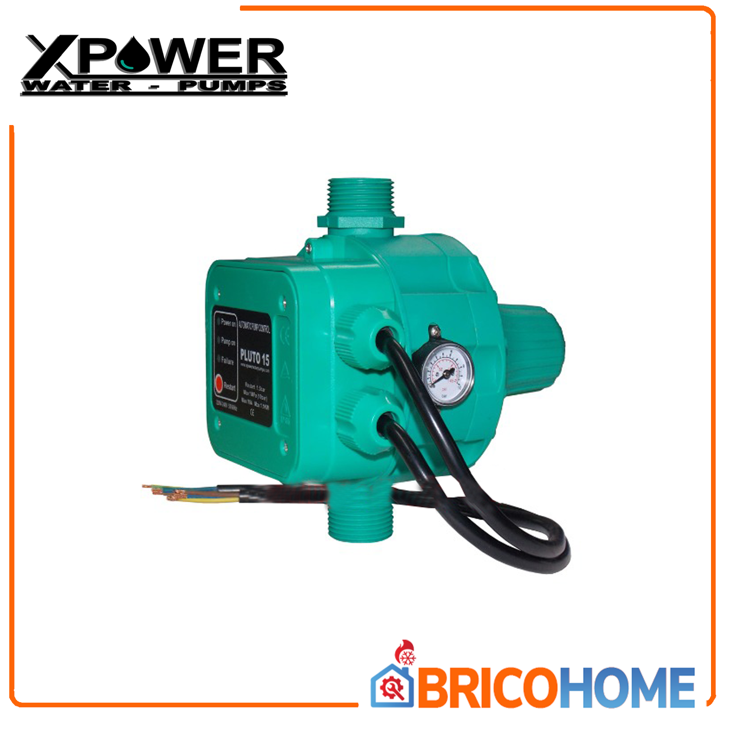 Presscontrol per automazione elettropompe di superficie e sommerse, gestisce start-stop pompa PLUTO   Funzione: Accessorio per automatizzare una elettropompa Alimentazione: 230Vac Start: Per bassa pressione  -   Stop: Per flusso fermo Regolazione start della pompa: No (per tutti i modelli)   Presscontrol Pluto 1,5: Start della pompa: 1,5Bar Presscontrol Pluto 2,2: Start della pompa: 2,2Bar   Protezione elettropompa da marcia a secco: Si Tentativi di ripartenza: No Pressione massima ammissibile: 10Bar In&Out: 1"   Presscontrol PLUTO15 & PLUTO22Il presscontrol Pluto è disponibile in 2 taglie con partenze pretarate da 1,5 Bar e 2,2 Bar, entrambi idonei per essere installati in abbinamento a pompe...