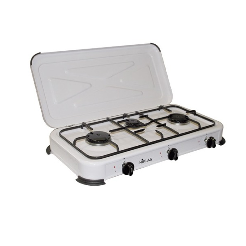 Fornello a Gas 3 Fuochi in Acciaio Porcellanato con Coperchio Ribaltabile ed Estraibile 56x29x11 cm colore Bianco