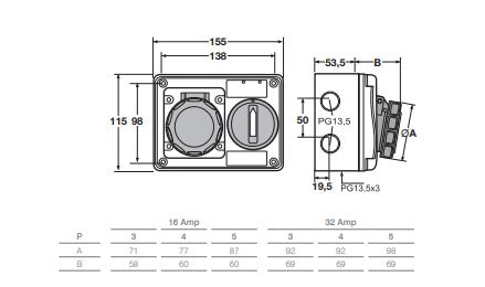 Presa interbloccata orizzontale con sezionatore da parete con fondo 400V 16A 3P+T IP4