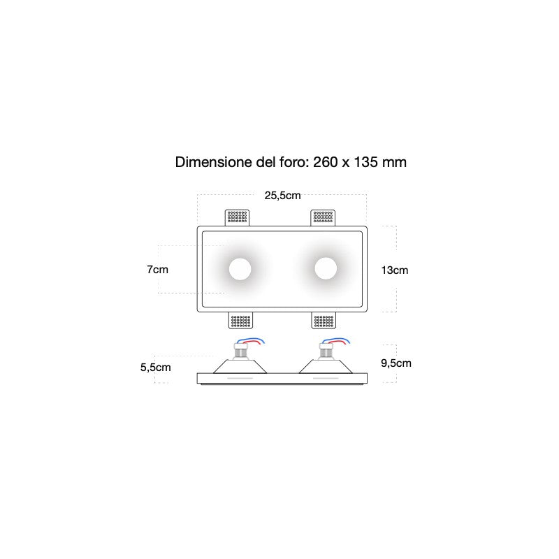 Portafaretto da incasso in gesso ceramico con forma conica, 25,5x13 cm, profondità 9,5 cm, completo di 2 portalampade GU10 e molla fermafaretto. Design elegante e funzionale.