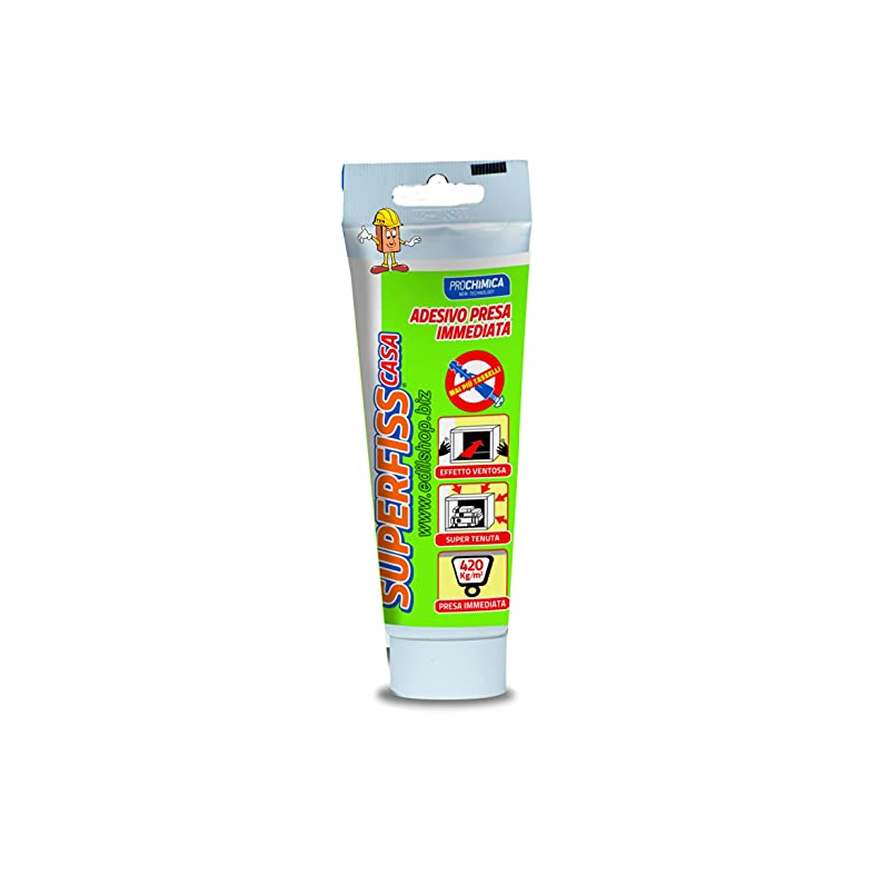 PROCHIMICA SUPERFISS CASA 80ml – Adesivo a Presa Rapida Effetto Ventosa   SUPERFISS CASA è un adesivo monocomponente a base di MS Polymer, progettato per garantire una presa iniziale ultra potente (fino a 420 kg/m²) e una tenuta definitiva fino a 160 kg/10 cm². Ideale per incollaggi strutturali senza supporti, è perfetto per applicazioni in ambienti domestici e professionali: arredo bagno, edilizia, falegnameria, impianti elettrici e trasporti. ✅ Effetto ventosa – incolla senza morsetti o nastri ✅ Presa iniziale: 420 kg/m² | Tenuta finale: 160 kg/10 cm² ✅ Verniciabile con colori a base d’acqua ✅ Inodore, privo di solventi, isocianati...