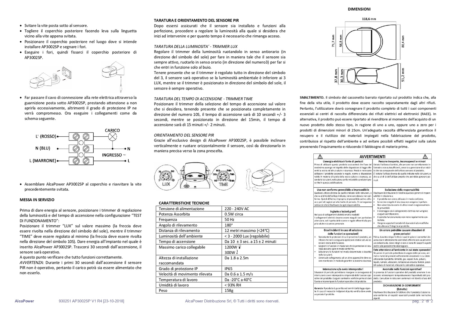 Tensione di alimentazione: 220 - 240 VAC