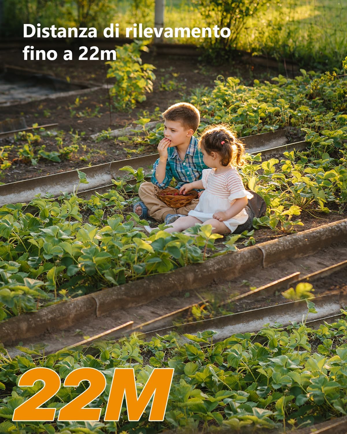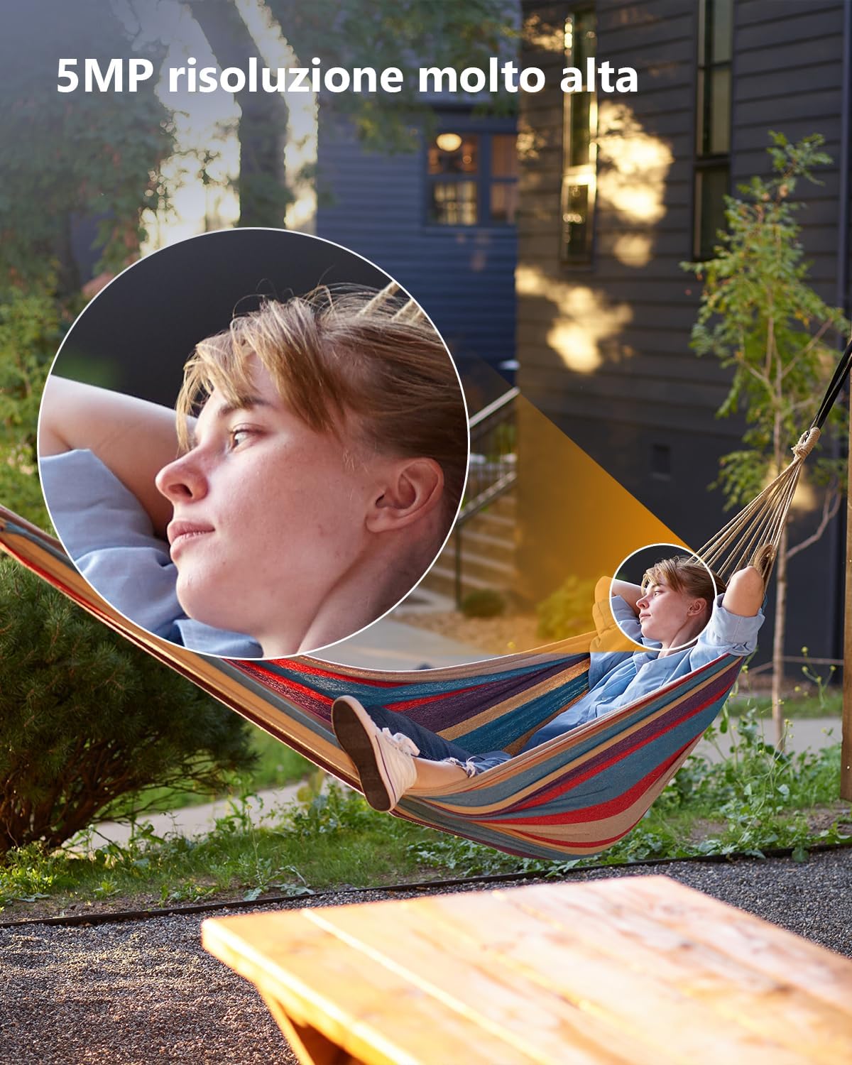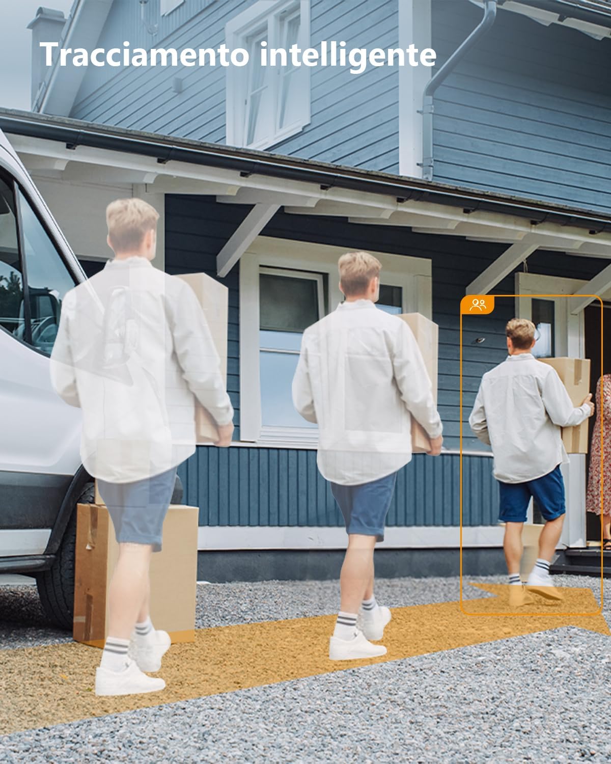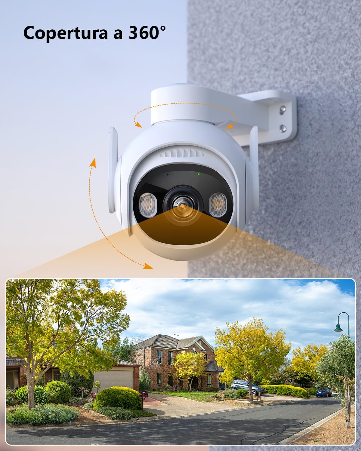 - 【Visione Notturna A Colori Full HD 5MP & 30 Metri】Grazie alla risoluzione Full HD 3K, questa telecamera wifi esterno ti offre immagini nitide. Quando la telecamera da esterno wifi rileva una figura umana, i faretti si accendono automaticamente, mostrandoti un'immagine a colori. Così puoi identificare il colore dell'auto o dei vestiti di uno sconosciuto anche di notte. A proposito, i faretti possono essere spente.