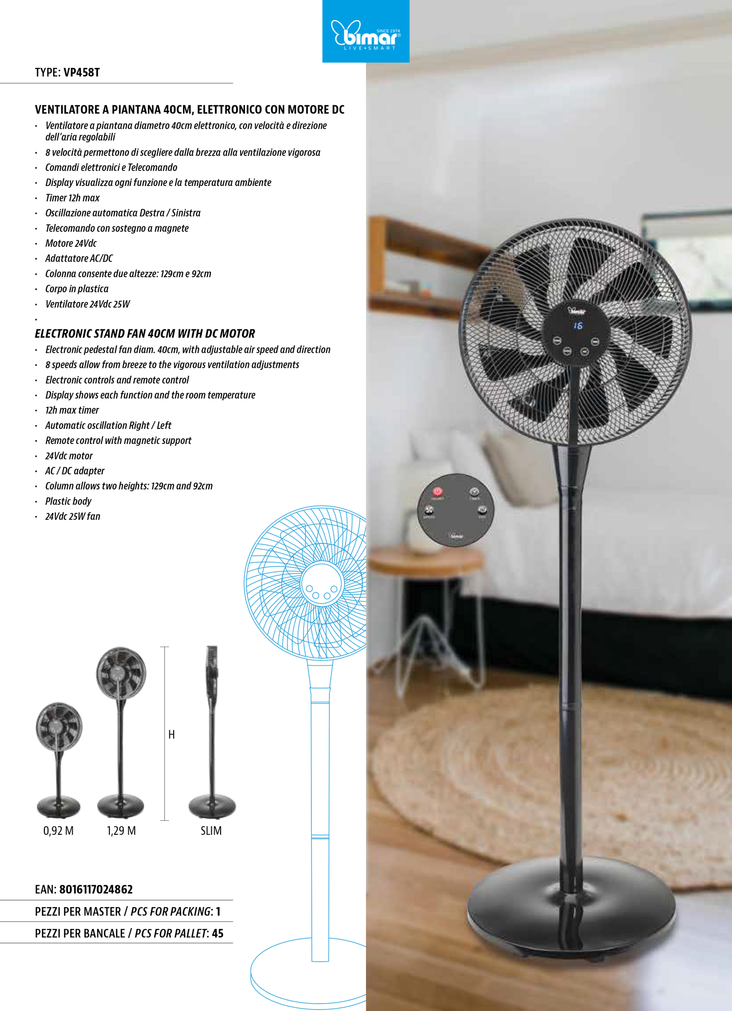 Bimar Ventilatore a piantana elettronico con motore DC Ø40cm