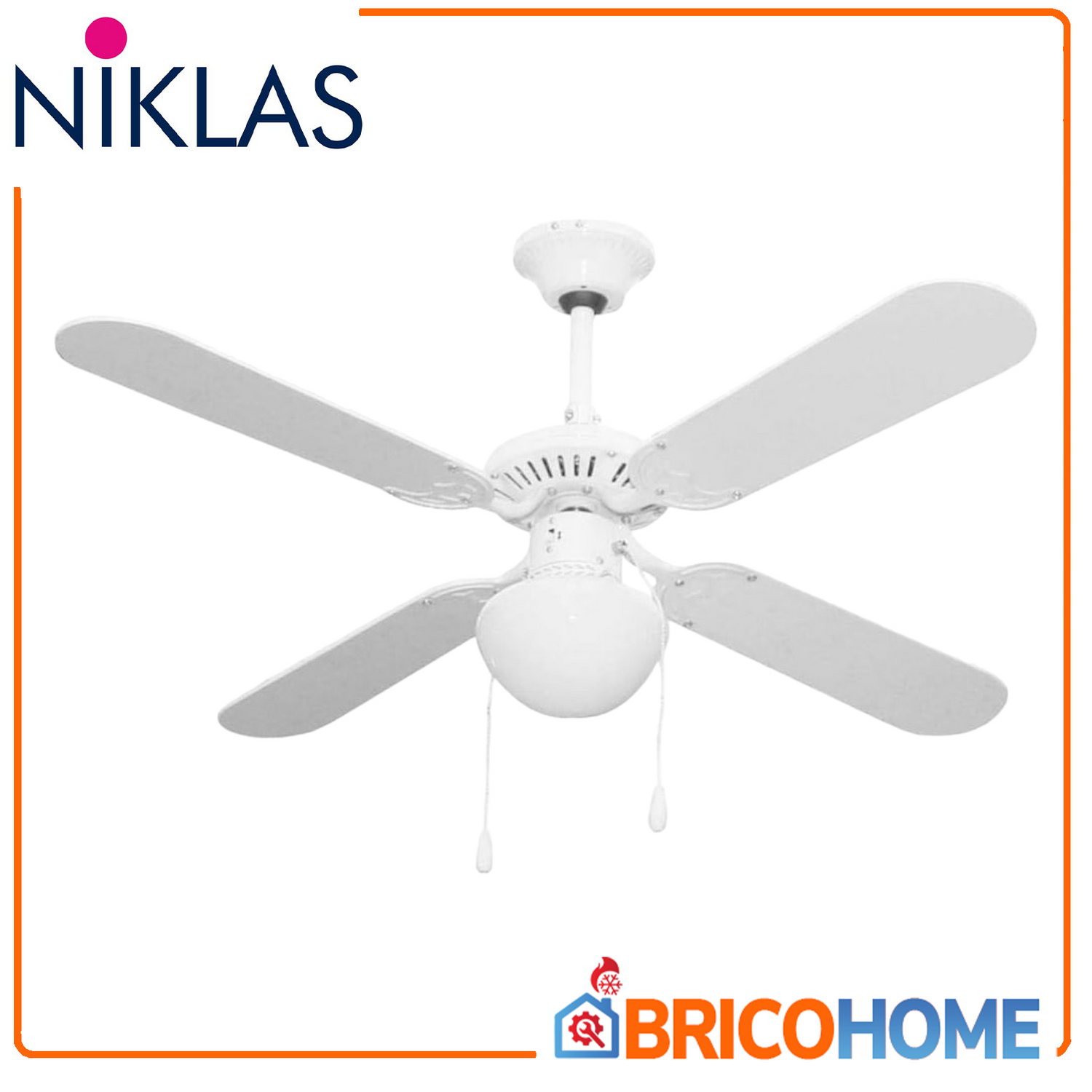 Ventilatore da soffitto Niklas Fly T 105 con catenelle di comando, 4 pale in legno MDF, 3 velocità regolabili ed 1 lampada max 60W – 230V/50Hz. Colore bianco. Diametro 105 cm.
