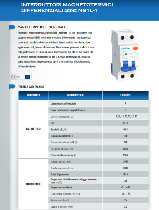 4,5-kA-Fehlerstromschutzschalter der Serie NB1L1 für thermisch-magnetischen/Differentialschutz. Besonders geeignet zum Schutz von Leitungen vor Überlast und Kurzschluss sowie vor direkter Berührung. Für Anwendungen im zivilen, tertiären und industriellen Bereich vorgesehen. Erhältlich in der 1P+N-Version mit 4,5 kA Schaltvermögen auf 2 DIN-Modulen. Nennstrom von 6 A bis 40 A und Differenzauslösestrom von 30 mA, mit thermisch-magnetischer Kennlinie Typ C und Differenzbetriebskennlinie Typ A. Kann mit Hilfskontakten, Alarmkontakten, Auslösespule und Mindestspulenspannung ausgestattet werden. Verfügbare Modelle: NB1L1/C6-1PN-4,5-A30 Differentialschutzschalter 1P+N 6A 30mA 4,5kA Kurve C Typ A NB1L1/C10-1PN-4,5-A30 Differential-Leistungsschalter 1P+N 10A 30mA 4,5kA Kurve C Typ A NB1L1/C16-1PN-4,5-A30 Differentialschutzschalter 1P+N 16A 30mA 4,5kA Kurve C...