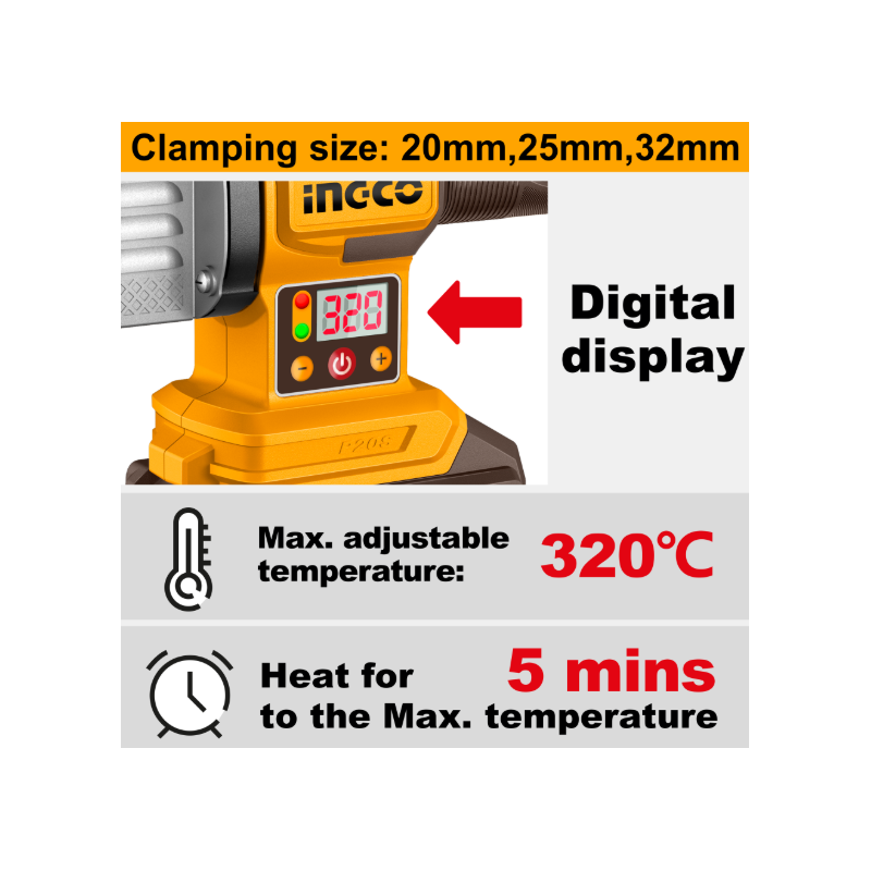 Il polifusore a batteria INGCO PTWTLI2018 è progettato per la saldatura professionale di tubi e raccordi in PP, PE e PPR. Grazie al funzionamento cordless con batteria al litio 20V (non inclusa), offre massima libertà di movimento, rapidità di riscaldamento e precisione operativa anche in spazi difficili da raggiungere.