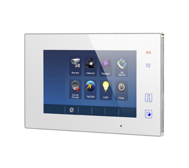 Weißer Freisprechmonitor SEM7ME, kompatibel mit dem See Easy 1SEK/ME-Line-Kit. Durch das moderne Design eignet es sich für den Einbau in den meisten modernen Wohnungen. Das große 7-Zoll-LCD-TFT-Display verbessert die Besuchererkennung, während die Touchscreen-Funktion und die Touch-Tasten eine wirklich unmittelbare Bedienung ermöglichen. Der Monitor ist mit einem intuitiven, mehrsprachigen, symbolbasierten OSD-Menü ausgestattet, das die Programmierung der Hauptfunktionen ermöglicht: die Einstellung B. des Datums und der Uhrzeit, die Auswahl des Klingeltons (differenziert für den Außenruf und für den Gegen- oder Etagenruf), die Lautstärke des Klingeltons kann für den Nachtbereich auf eine andere Stufe eingestellt werden. Das System ermöglicht die automatische Speicherung eines Bildes des Besuchers oder, wenn ein optionaler SD-Speicher eingesetzt ist, eine Videosequenz. Die Installation wird wirklich vereinfacht, da nur zwei Kabel (nicht polarisiert) parallel zum Hauptmonitor benötigt werden. Wird komplett mit Wandmontagehalterung und Befestigungszubehör geliefert.