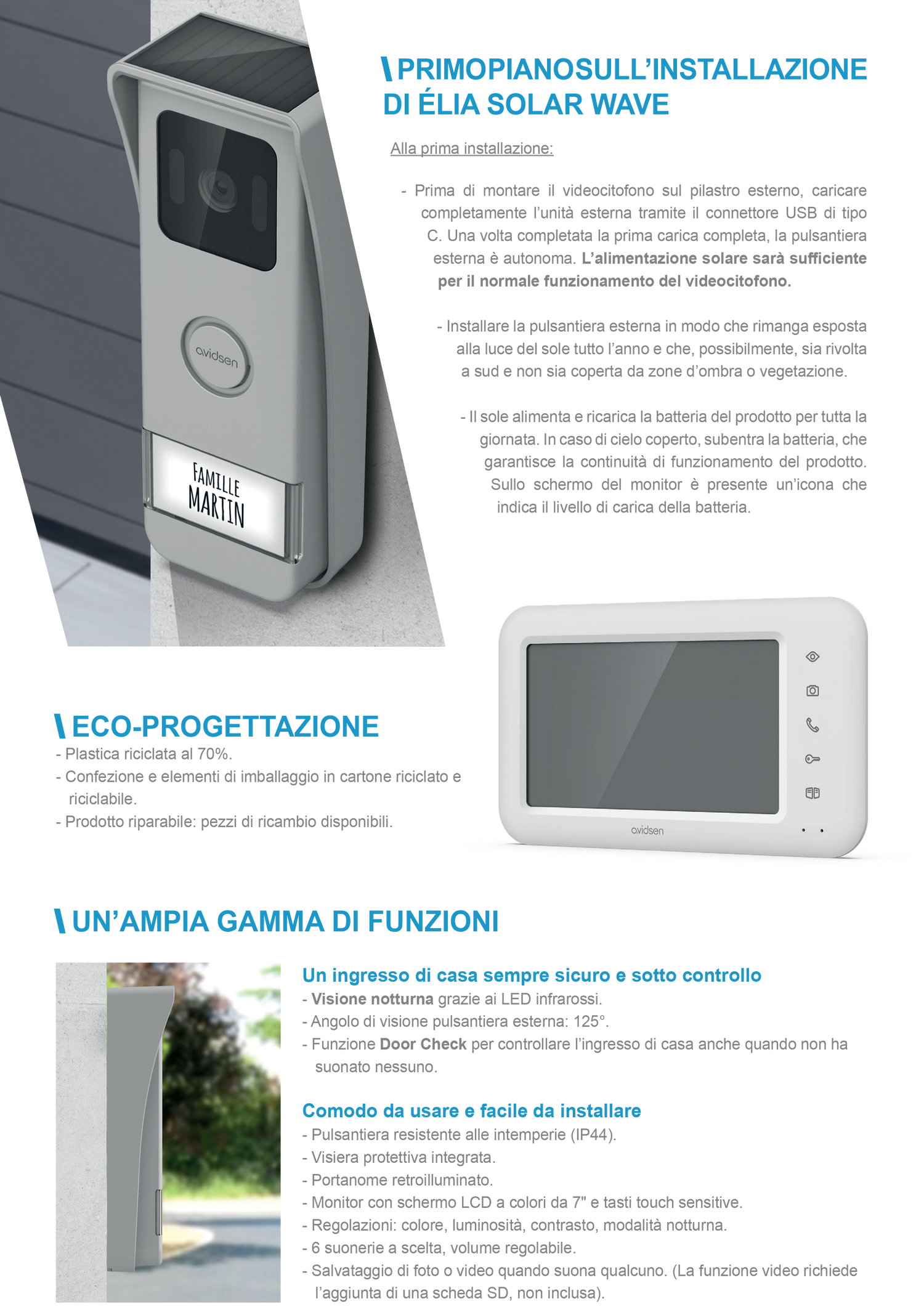 - Facilità di installazione: Il videocitofono Elia Solar Wave è progettato per essere installato senza particolari competenze tecniche. L'unità esterna non richiede collegamenti elettrici grazie al pannello solare integrato, e il monitor interno è completamente wireless, rendendo l'installazione del videocitofono Elia Solar Wave semplice e veloce. Non è necessaria l’alimentazione elettrica per l’unità esterna.