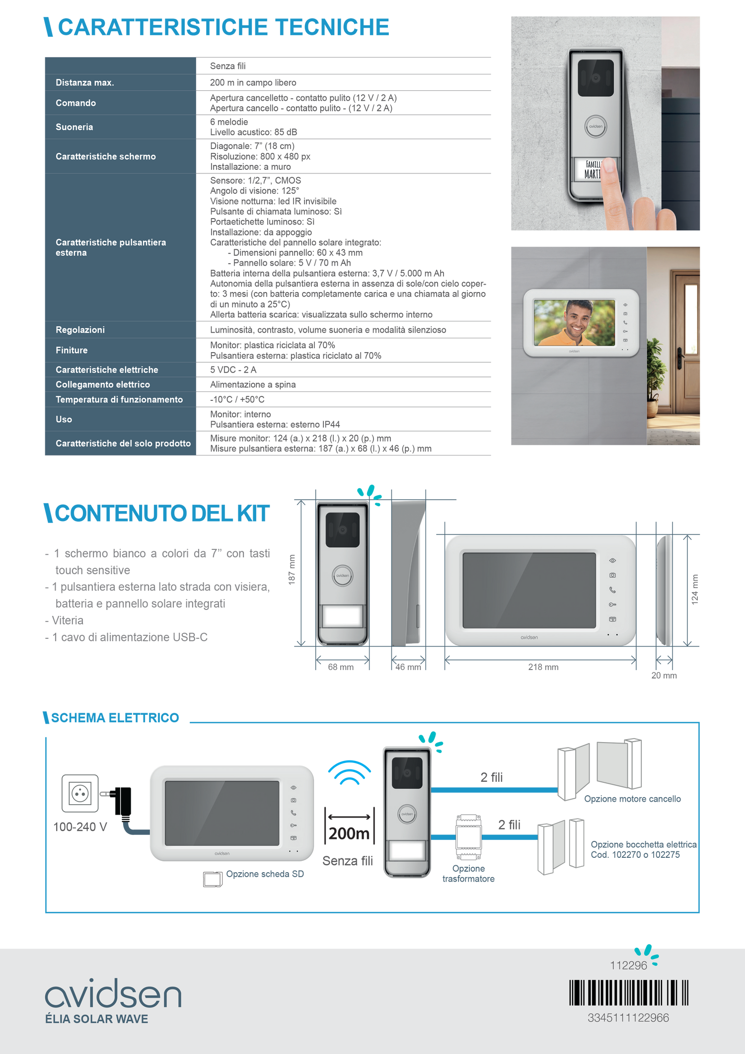 - Wireless completo: Per l'installazione non sono necessari cavi tra la pulsantiera esterna e lo schermo interno.
