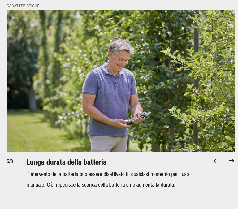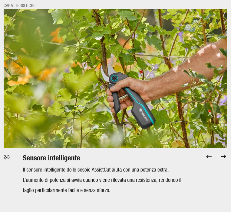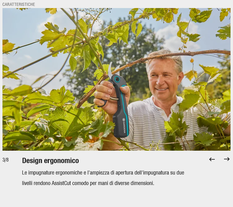 Cesoia AssistCut Larghezza di taglio massima 25 mm Potenza e precisione a portata di mano Le cesoie a batteria AssistCut di GARDENA sono l'assistente ideale per il taglio facile e senza sforzo di rami, giovani germogli e fiori con un diametro massimo di 25 mm. Le cesoie a batteria hanno un sensore intelligente, che fornisce fino a 5 volte in più di potenza (rispetto a una cesoia tradizionale) quando si tagliano rami più spessi non appena viene rilevata una resistenza. Le cesoie riducono l'affaticamento della mano, rendendo ancora più facile completare le attività di giardinaggio senza sforzo. Quando la batteria è...