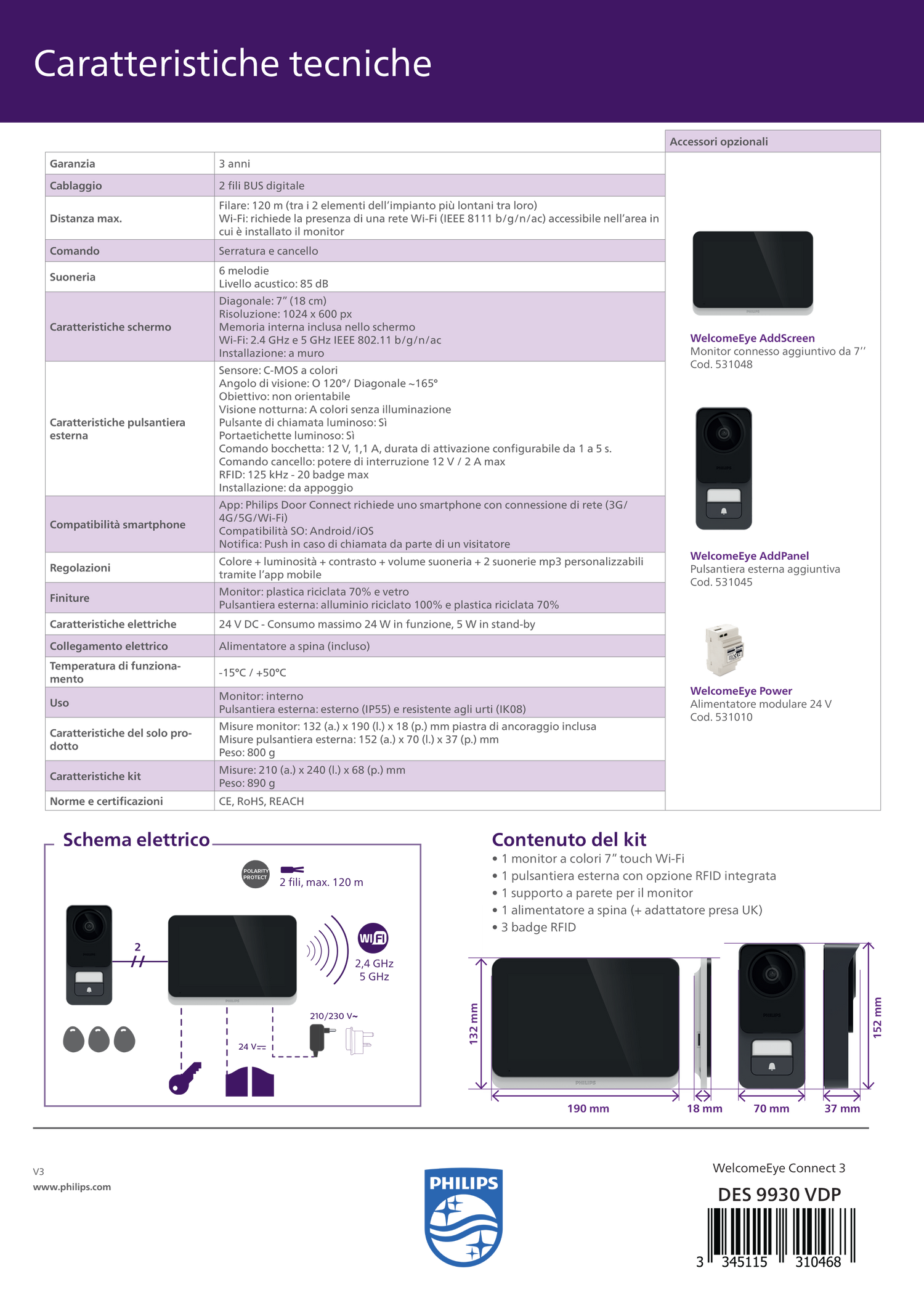Videocitofono Philips WelcomeEye Connect 3 Videocitofono da 7’’ con touch screen connesso, ottima qualità dell’immagine3K (2592x1944) e nuove funzioni inedite per migliorare prestazioni e comfort e predisposizione per sistemi bifamiliari. Posto esterno IP55 IL VIDEOCITOFONO CONNESSO TOP DI GAMMA DI PHILIPS SI ARRICCHISCE DI NUOVE FUNZIONI INEDITEQualità dell’immagine 3K (2592 x 1944) , visione notturna senza LED, pulsante per chiamata di emergenza, suoneria MP3 personalizzabile, creazione di codici QR per l’accesso temporaneo e tanto altro ancora! Il videocitofono Philips WelcomeEye Connect 3 diventa davvero indispensabile per accogliere chi suona alla porta. Usa il touch screen del monitor o anche semplicemente il...