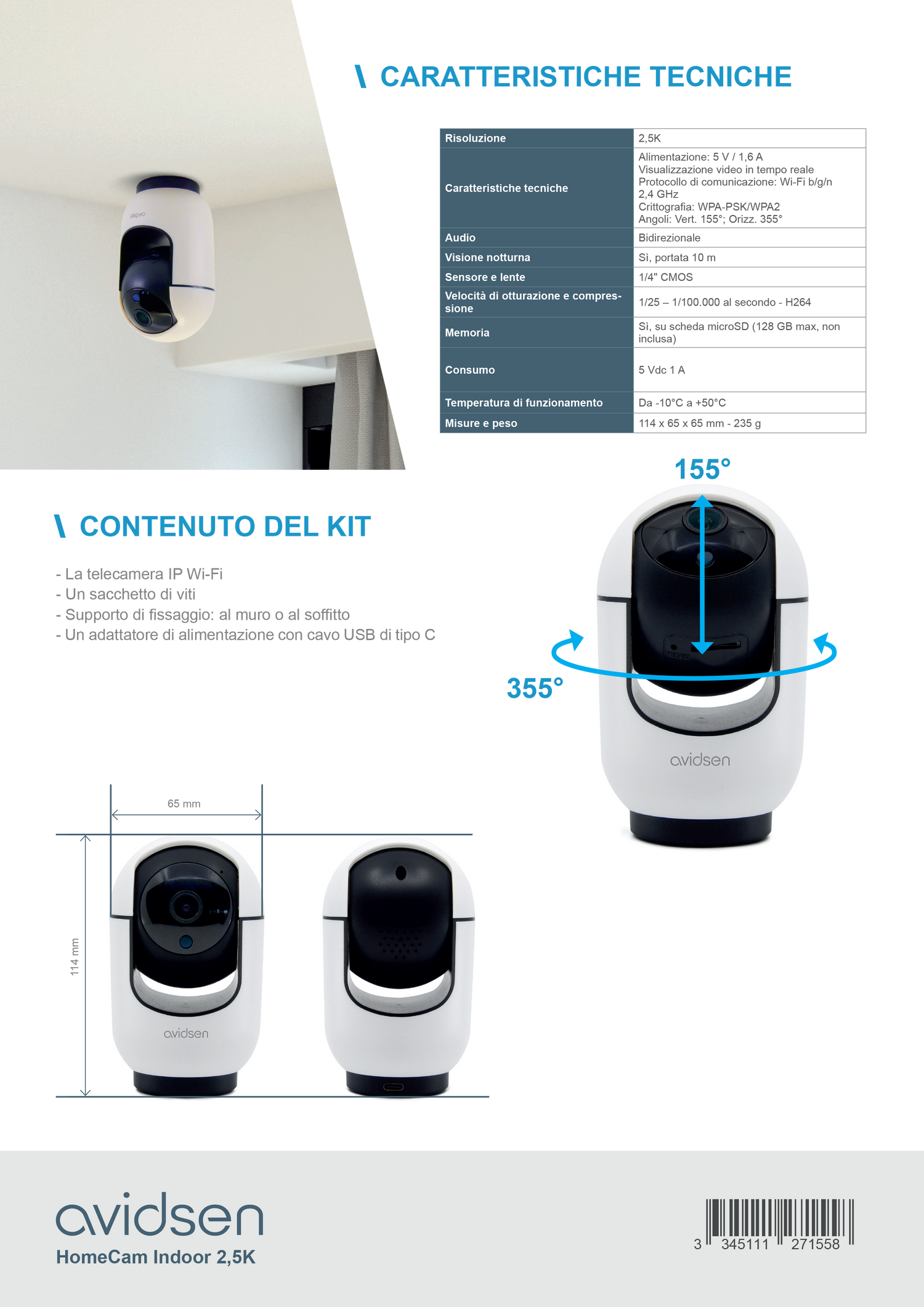 Telecamera IP Wi-fi motorizzata per interni 2,5K 360° sorveglianza HomeCam Indoor - Avidsen
