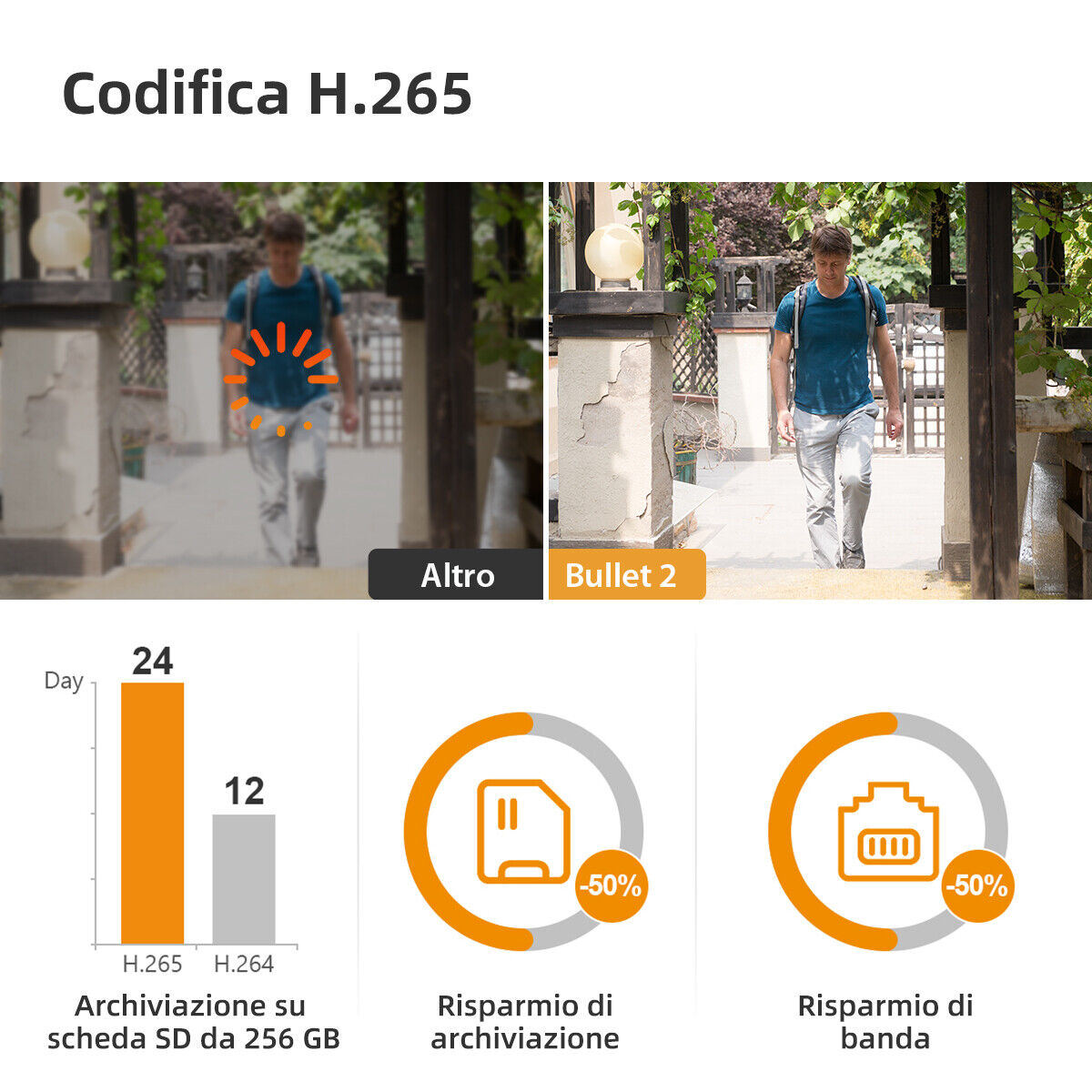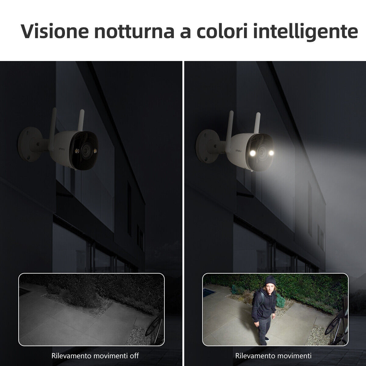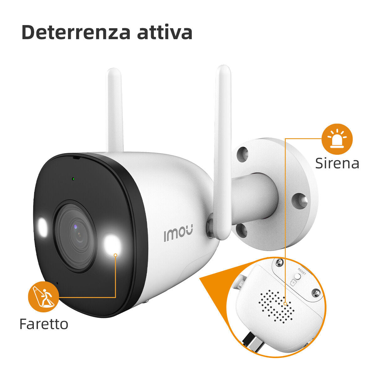 Imou Bullet 2. Type: IP security camera, Placement supported: Indoor & outdoor, Connectivity technology: Wired & Wireless. Form factor: Lug, Mounting type: Ceiling/wall, Color of product: White. Viewing angle, horizontal: 102°, Viewing angle, vertical: 54°, Viewing angle, diagonal: 120°. Sensor type: CMOS, Optical sensor size: 25.4 / 2.8 mm (1 / 2.8"). Digital zoom: 16xSmart color night vision Four smart night vision modes provide sharp color or black and white images even in total darkness. Infrared Mode Advanced IR algorithms provide sharp black and white images even in total darkness. Color Mode With the two built-in spotlights, you can light up in Night Vision mode while shooting color images. Color mode also works outdoors. Smart mode If you switch to smart mode, you can activate black and white night vision. After detecting suspicious movement, the spotlights turn on automatically taking color images. Off mode If you don't need outdoor lighting at night, you can activate the Off mode to reduce light pollution. People Detection Innovative image processing technology quickly locates people by filtering out other negligible items and instantly sends a notification to your smartphone. Monitor what matters without getting annoying false alarms. Full HD 1080P video and H.265 compression The 1080P sensor and advanced IR algorithms deliver razor-sharp video day or night. State-of-the-art H.265 compression reduces network bandwidth and storage space usage by 50% while maintaining the same video quality. Active Deterrence When the Bullet 2 detects an intrusion, the built-in spotlight and 110dB siren keep unwanted guests away and you get notified. Waterproof IP67-rated weatherproof shell for using in multiple scenarios. Dual antennas and MIMO Dual antennas and 2x2 MIMO technology resist interference, even at long distances. Two-way communication Built-in speaker and microphone with echo cancellation to communicate with family and pets or deter unwanted guests. Alarm Notifications Receive instant notifications on your smartphone whenever motion is detected to stay up to date on what's happening at your home or business wherever you are. External Waterproof Reset Button Press and hold 10 seconds to reset the camera. No need to mess with the cover or hidden switches! Multiple storage options Video recordings are stored securely and accessible on SD card, video recorder (NVR) or cloud. Imou Cloud Imou Cloud makes your life easier with notifications, real-time video streaming, and one-tap firmware updates. Multiple Lens Options Wide choice of lens focal lengths for different scenarios.