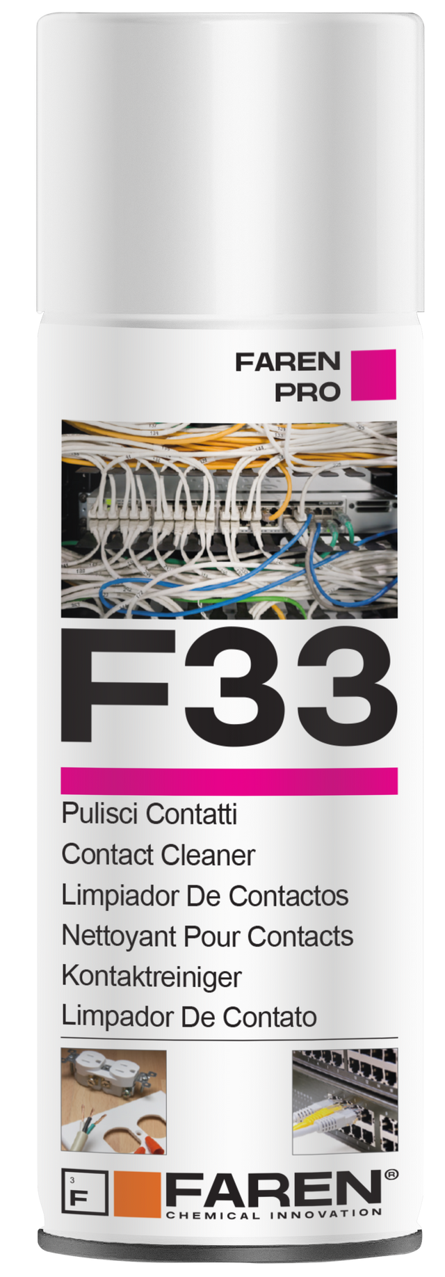 FAREN F 33 CLEAN CONTACTS WITH PROTECTIVE ACTION ML. 400 Solvent-based degreaser in Spray. Ideal for any electrical and electronic product such as: ELECTRICAL PANELS, RELAYS, CONTACTOR SWITCHES, TERMINAL BLOCKS, PRINTED CARDS, INTEGRATED CIRCUITS, etc. Great for POTENTIOMETER; the light residual lubrication is ideal for protecting and lubricating them. Appearance: Colorless liquid Packaging: 400ml spray Shelf life: 24 months in intact packaging Dielectric: Up to 50,000 volts Relative density: 0.630 kg/lt Odour: Characteristic Recommendations: Store the product in a dry place and do not store it at temperatures below 5 °C and above 35°C. Store in a cool, dry place away from heat sources. Keep out of reach of children. APPLICATIONS - ADVANTAGES DIELECTRIC Up to 50,000 Volts. PROTECTIVE Leaves a very light protective film after use. SAFE On components and surfaces EXCELLENT Even in model making METHOD OF USE ELECTRIC AND ELECTRONIC EQUIPMENT: Before reconnecting power, make sure that the product has completely evaporated. DO NOT use near sources of heat, ignition and in the vicinity of open flames. Shake the can and spray abundantly on the surface to be treated from a distance of about 20cm. If necessary, blow off the excess product. For particularly dirty electrical panels, repeat the operation a second time.