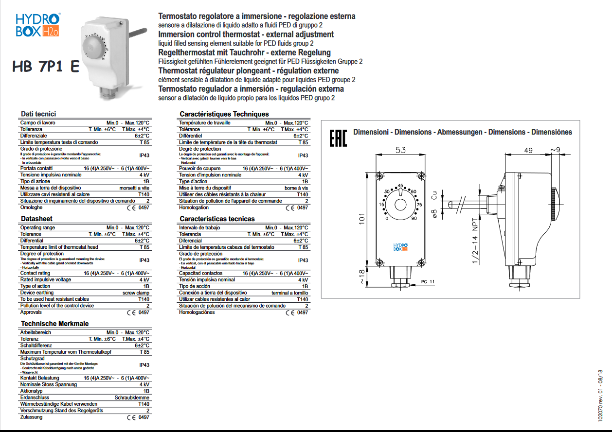 Immersion thermostat 0-90°C external regulation HB 7P1 E - 102070
