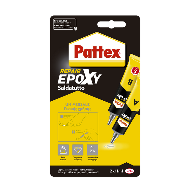 If you are looking for a waterproof adhesive to bond different materials in a durable and reliable way, Pattex Saldatutto will be your best ally. Strong, resistant and durable, this epoxy resin-based glue has excellent filling power and high final strength. Perfect for almost any material, it can be used for example on metals, stone, wood, ceramics, glass and many plastics*. The powerful adhesive is clear when dry and does not expand or contract while curing. The two-component adhesive is resistant to water, oil and common solvents and can be used both indoors and outdoors, in fact it withstands temperatures from -30°C to +80°C.