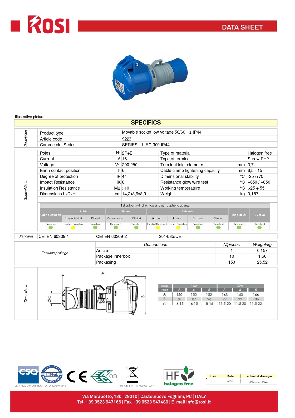Description Low voltage mobile socket Product code 9223 Commercial series SERIES 11 IEC 309 IP44 Poles No. 2P+E Current 16A Voltage 200-250V Position 6h IP rating 44 IK grade 8 Thermal stability -25 /+70 Glow Wire +650 / +850 °C Materials Abs / Nylon / Ruber Product dimensions 14.2x8.9x8.9 mm Product weight 0.157 kg