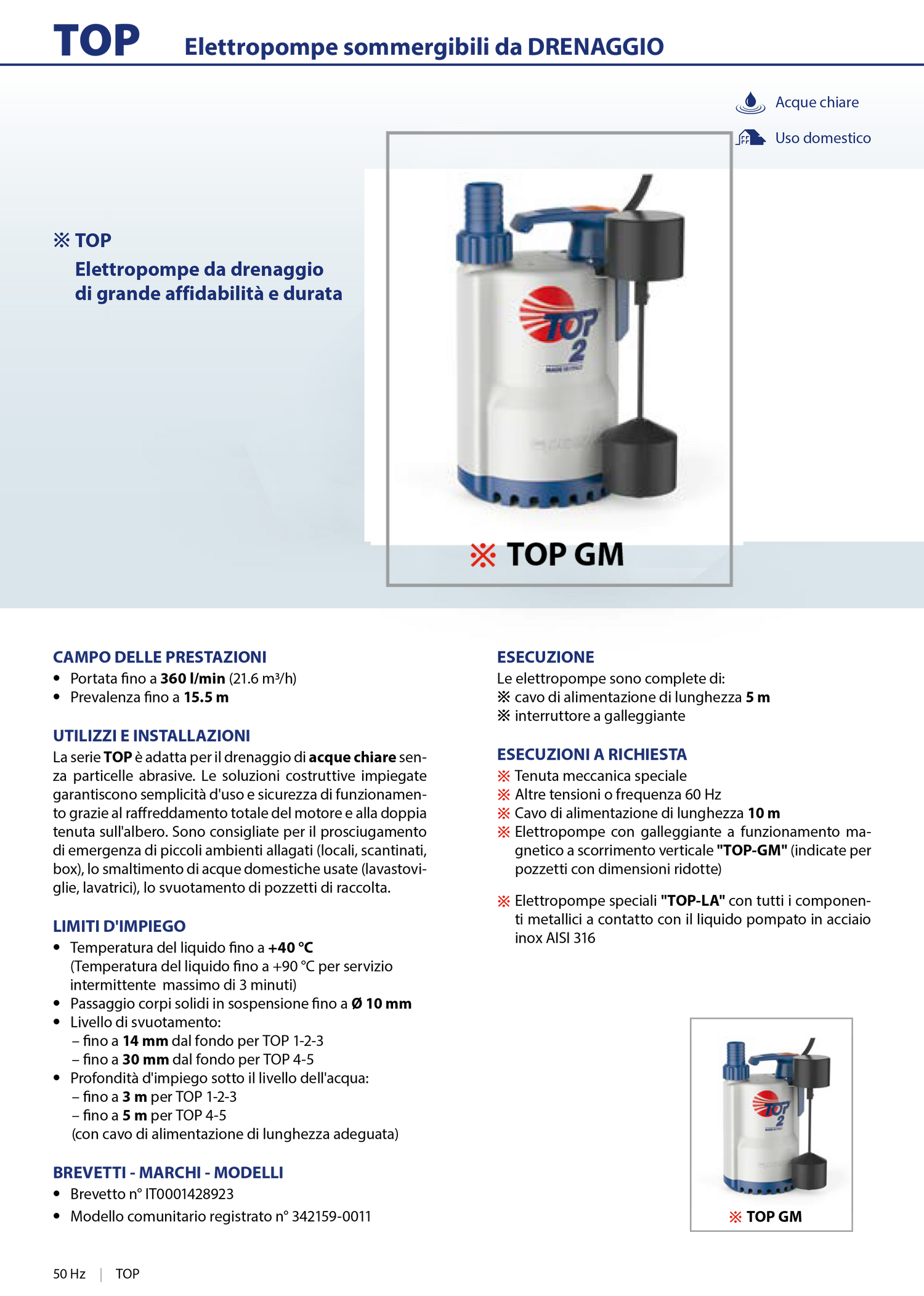 Elettropompa sommergibile per drenaggio acque chiare 0,75HP TOP3 -GM PEDROLLO