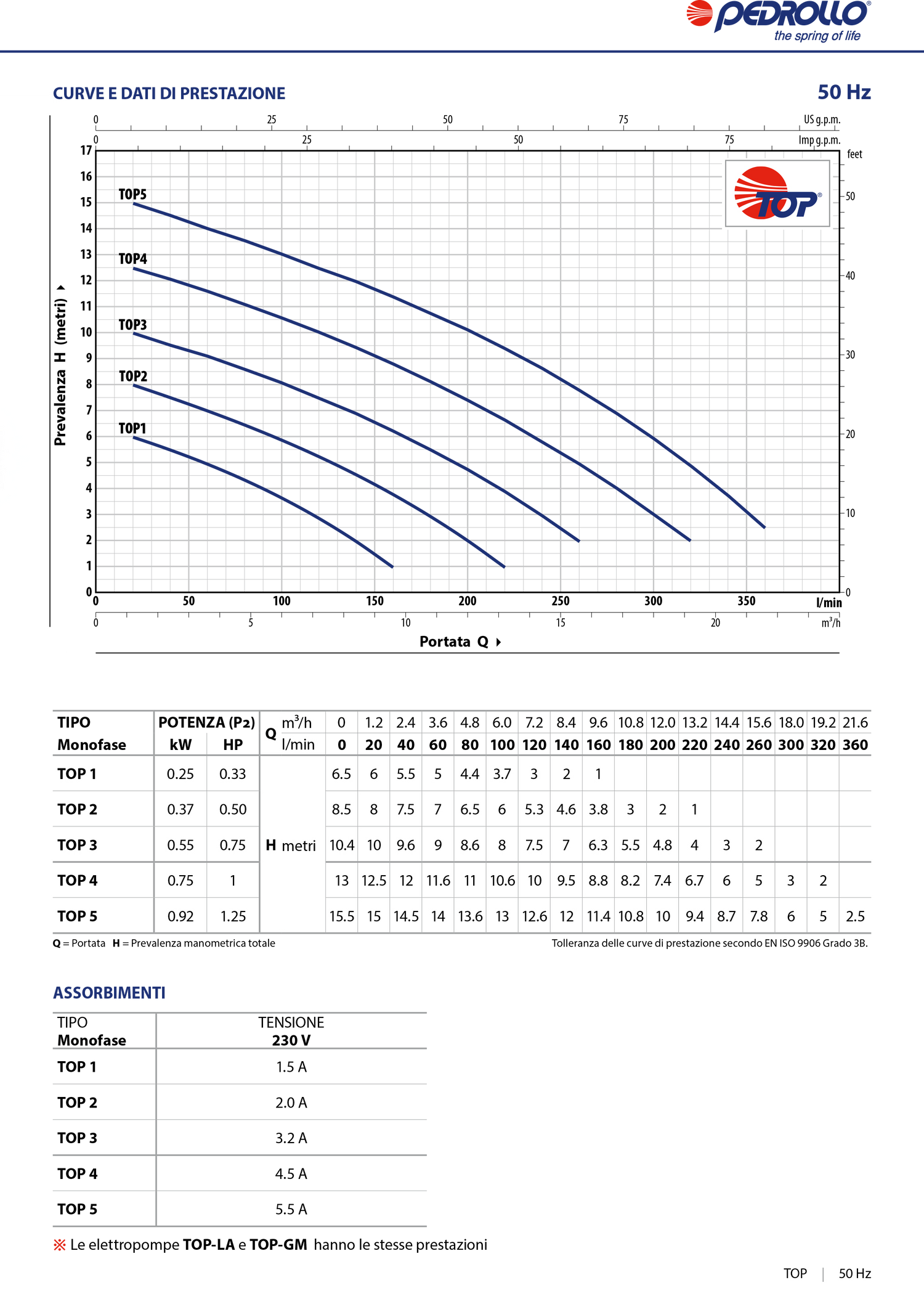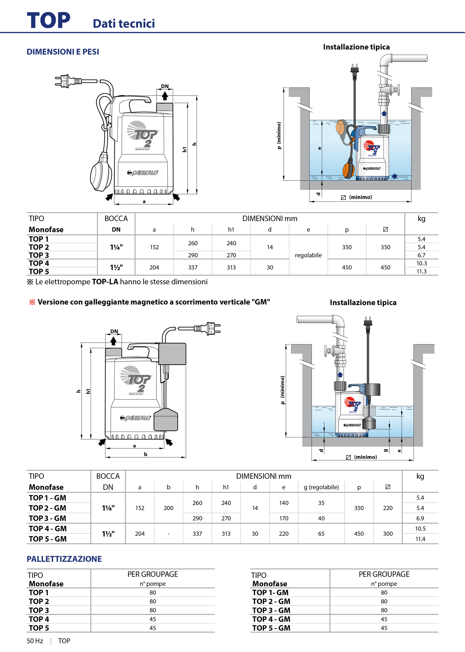 Elettropompa Sommersa con galleggiante magnetico TOP3 - GM 0,55kW - 0,75HP Portata : 20/260 litri/minuto Prevalenza MAX 10 metri Elettropompa sommergibile da drenaggio modello Top3Adatta per il drenaggio di acque chiare senza particelle abrasiveLe soluzioni costruttive impiegate garantiscono semplicità d'uso esicurezza di funzionamento grazie al raffreddamento totale del motore e alladoppia tenuta sull'alberoConsigliata per il prosciugamento di emergenza di piccoli ambienti allagati(locali, scantinati, box),lo smaltimento di acque domestiche usatelo svuotamento di pozzetti di raccoltaTipo: Elettropompe sommergibili da DRENAGGIOTipo d'acqua: Acque chiareCaratteristiche: Sommergibile Le elettropompe sono complete di:※ cavo di alimentazione di lunghezza 5 m※ interruttore a galleggiante Scheda tecnica disponibile qui