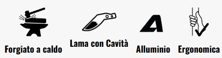 Professional shears with curved stop that allows to hold the branch still during the cutting phase avoiding the kickback on the wrist. The handle is of the universal type suitable for right and left-handed users. The handle and counter-blade in light aluminum alloy are hot forged, the surface treatment with anodic oxidation allows greater resistance over time. The steel blade with a high percentage of carbon is hot forged. The notch in the blade decreases the effort required for cutting because it increases penetration into the branch. Like all manual pruning tools, it is fully interchangeable and adjustable.