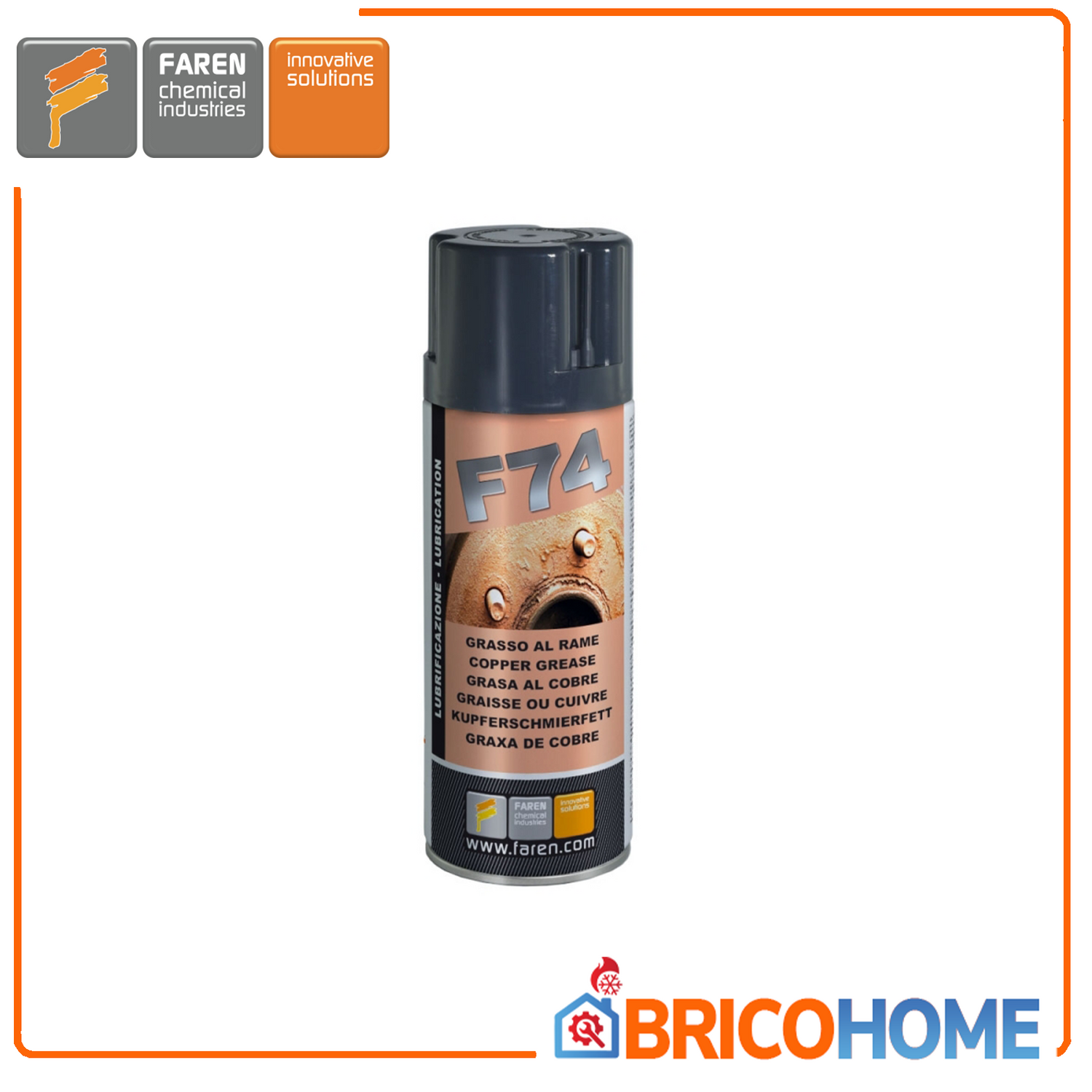 FAREN F 74 COPPER GREASE SPRAY BOTTLE ML. 400 COPPER ANTI-SEIZE LUBRICANT GREASE. FOR LUBRICATION OF PARTS SUBJECT TO VERY HIGH TEMPERATURES AND HIGH STRESSES. Appearance: Coppery viscous liquid Solubility: Insoluble in water Packaging: 400ml spray Operating temperature: -40/+1000°C Relative density: 0.640 kg/lt Odour: Characteristic Recommendations: Store the product in a dry place and do not store it at temperatures below 5°C and above 35°C. Store in a cool, dry place away from heat sources. Keep out of reach of children. ADVANTAGES RESISTS TEMPERATURES OF OVER 1000°C. IT KEEPS ITS ELASTICITY, WITHOUT DRYING EVEN IN SALINE ENVIRONMENTS. EXCELLENT PROTECTION AGAINST CORROSION AND OXIDATION. EXCELLENT ANTI-WEAR PROPERTIES - RESISTANCE TO CHEMICAL AGENTS AND WATER, EVEN SALT. APPLICATIONS - METHOD OF USE In the molding of plastic materials and metal die-casting. Prevents engine head studs from seizing. For jointed elbows of mufflers, for servomechanisms of burners and/or boilers, to protect battery terminals, etc. Shake the can for about one minute. When dispensing, the color should be a nice copper red, ensuring that the micronized copper particles are well mixed. Always apply with the appropriate straw.