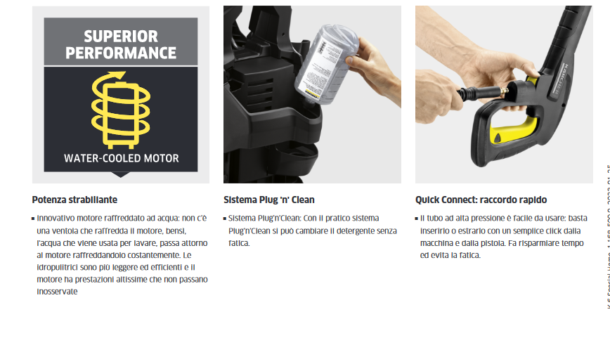 Acqua fredda, motore a induzione con raffreddamento ad acqua, potenza 3000 Watt, pressione max 160 Bar, portata max 600L/h. In dotazione: pistola alta pressione, tubo alta pressione 8 mt., lancia Vario-Power con regolazione continua della pressione, lancia mangia sporco