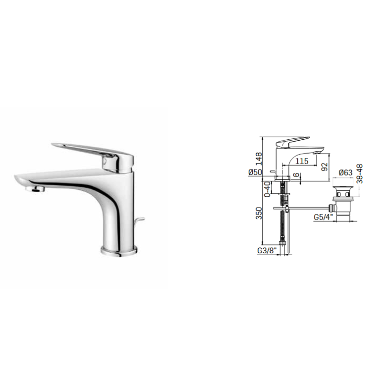 Miscelatore monocomando per lavabo, con scarico, finitura Cromo Miscelatore monocomando per lavabo con piletta da 1-1/4” Contenuto della confezione Rubinetto  Piletta da 1-1/4''con salterello  2 x flessibili da 3/8'' da 40cm - sporgenza 115 mm.- altezza totale 148 mm.- altezza base - aeratore 92 mm.- foro di installazione Ø35 mm.- tubi alimentazione flessibili G.3/8”- scarico da G.5/4”- Ricambi: cartuccia a dischi ceramici Ø35 art. 19M Scheda tecnica disponibile qui