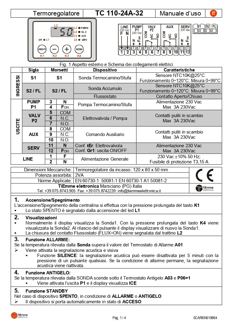 Termoregolatore TC 110-24A-32 Versione 2023 - MAXIFLAME l Termoregolatore permette di gestire in maniera completa ed efficace il sistema di riscaldamento in cui inserito il termocamino. Le molteplici opzioni di scelta per la placca del TC110, rendono il prodotto versatile anche in termini di design. Gestisce fino a 6 Configurazioni di impianto Tramite i suoi ingressi possibile rilevare: Temperatura di mandata dell’impianto Temperatura di ritorno dell’impianto Temperatura di boiler/accumulo sanitario Consenso flussostato prelievo acqua calda sanitaria Tramite le uscite possibile controllare i dispositivi presenti nell’impianto quali: Pompa impianto Pompa di ricircolo / Elettrovalvola Consenso caldaia a gas. Service   Dimensioni...