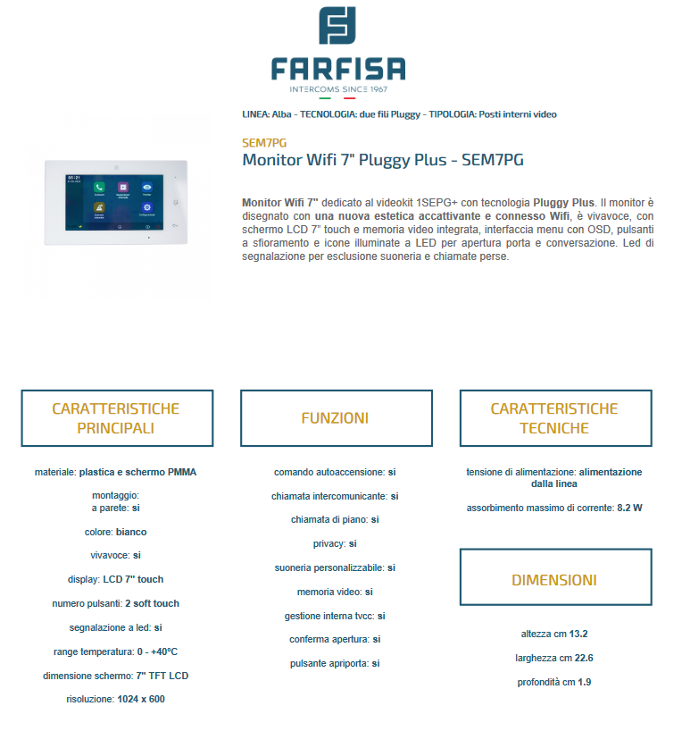 Monitor Wifi 7" Pluggy Plus - SEM7PG FARFISA is backordered and will ship as soon as it is back in stock.