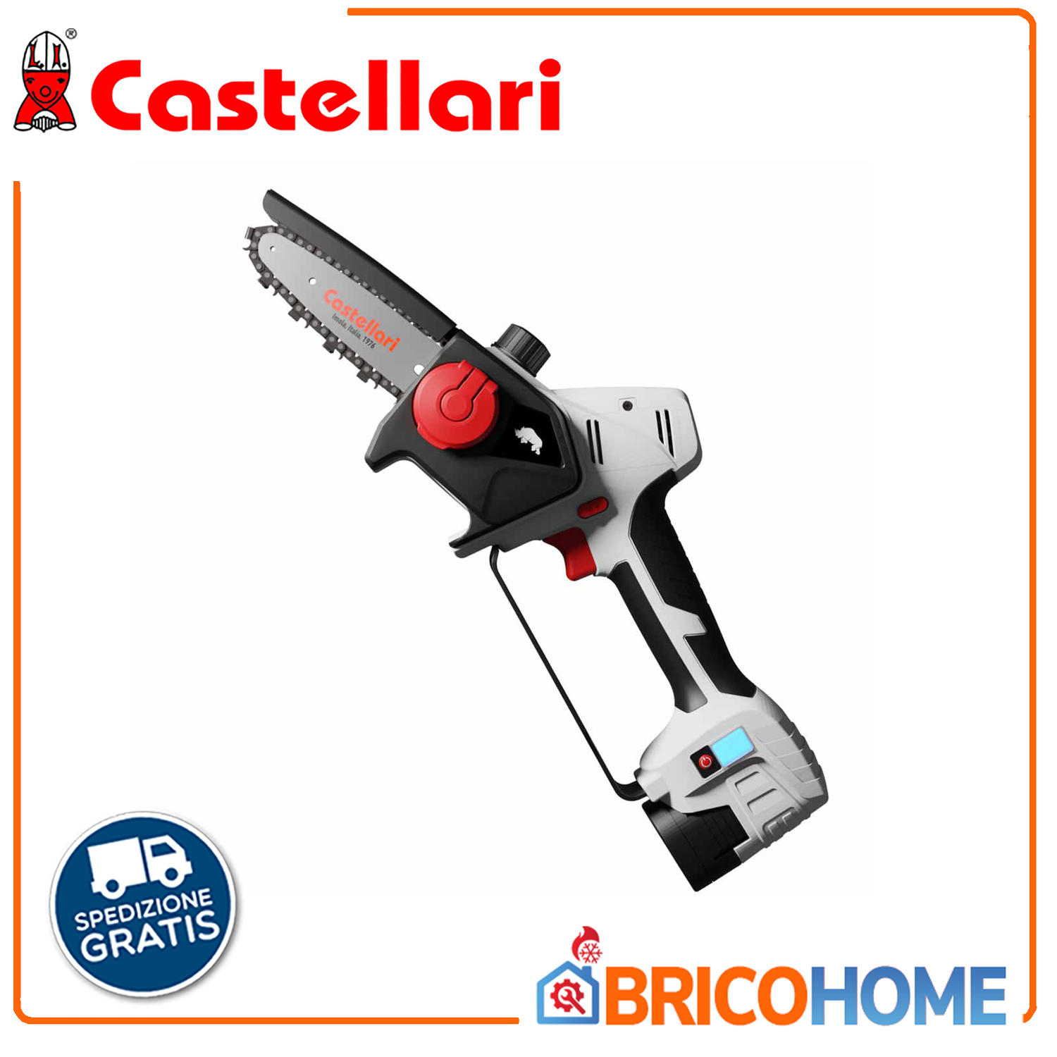 Potatore elettrico con batteria a litio RY100 - CASTELLARI DESCRIZIONE RY100 è una potatore elettrico con batteria al litio. Utile e maneggevole, grazie al motore da 500W consente di potare rami fino a 80 mm. La lubrificazione automatica, mantiene sempre oliata la catena mentre la barra carving agevola la potatura nelle chiome più folte. Il pratico sportello consente di accedere direttamente al vano motore per una rapida pulizia. RY100 è dotato di due batterie, carica batterie, fodero, cacciavice e lima.