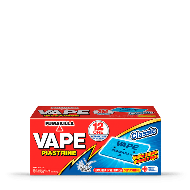 Una piastrina VAPE MAT "e" dura 12 ore senza perdere efficacia. Protegge delle zanzare comuni e tigre (Culex pipiens - Aedes aegypti - Aedes albopictus) esplicando un'azione insetticida in ambienti chiusi e luoghi all'aperto (balconi, portici ecc).