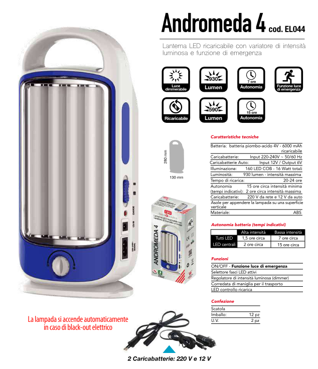- Funzioni: ON/OFF, Funzione luce di emergenza (la lampada si accende automaticamente in caso di black-out elettrico)