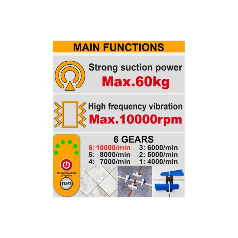 VENTOSA VIBRANTE 130MM 60KG Modello CTVLI20018E – Con kit di carica e accessori La ventosa vibrante CTVLI20018E è uno strumento professionale progettato per la movimentazione e la posa di materiali pesanti e delicati come piastrelle, lastre ceramiche, marmo e vetro. Grazie al diametro da 130 mm e alla capacità di sollevamento fino a 60 kg, garantisce un’adesione sicura e stabile. La funzione vibrante facilita l’eliminazione di bolle d’aria e assicura una perfetta adesione del materiale al supporto. Il kit di carica e gli accessori inclusi rendono l’utilizzo pratico e immediato, ideale per professionisti dell’edilizia e posatori. ⚙️ Scheda tecnica Caratteristica Dettagli...