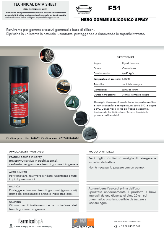 FAREN F51 RAVVIVANTE NERO GOMME SPRAY ML. 400 F51 Riferimento Cod. 969 NERO GOMME Ravvivante per gomme e tessuti gommati CON siliconi. Ripristina in un istante la naturale lucentezza, proteggendo e rinnovando le superfici trattate. Confezioni Disponibili: 400ml. Ravvivante per gomme e tessuti gommati CON siliconi. Ripristina in un istante la naturale lucentezza, proteggendo e rinnovando le superfici trattate. AUTO & MOTO Per rinnovare, ravvivare e ridare lucentezza a tutti i tipi di pneumatici. NAUTICA Protegge e rinnova i tessuti gommati (gommoni) prima del rimessaggio a fine e inizio stagione. CAMPING Ottimo per il trattamento e la protezione dei tessuti gommati in genere. COME Agitare la bomboletta e spruzzare sulla superficie da una distanza di circa 20cm.