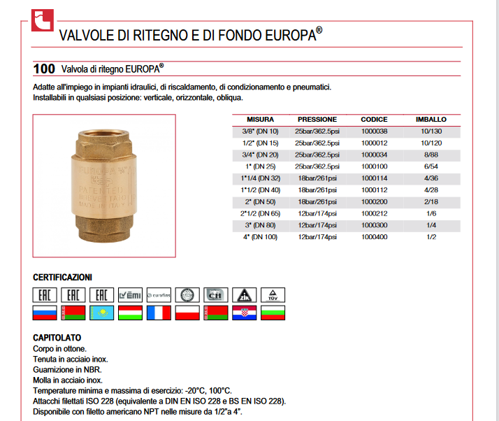 Valvola di ritegno in ottone 3/4'' (DN 20) EUROPA® ITAP