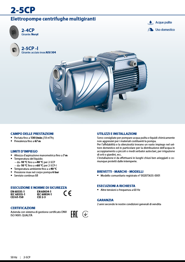 - Sono consigliate per pompare acqua pulita e liquidi chimicamente non aggressivi per i materiali costituenti la pompa.
