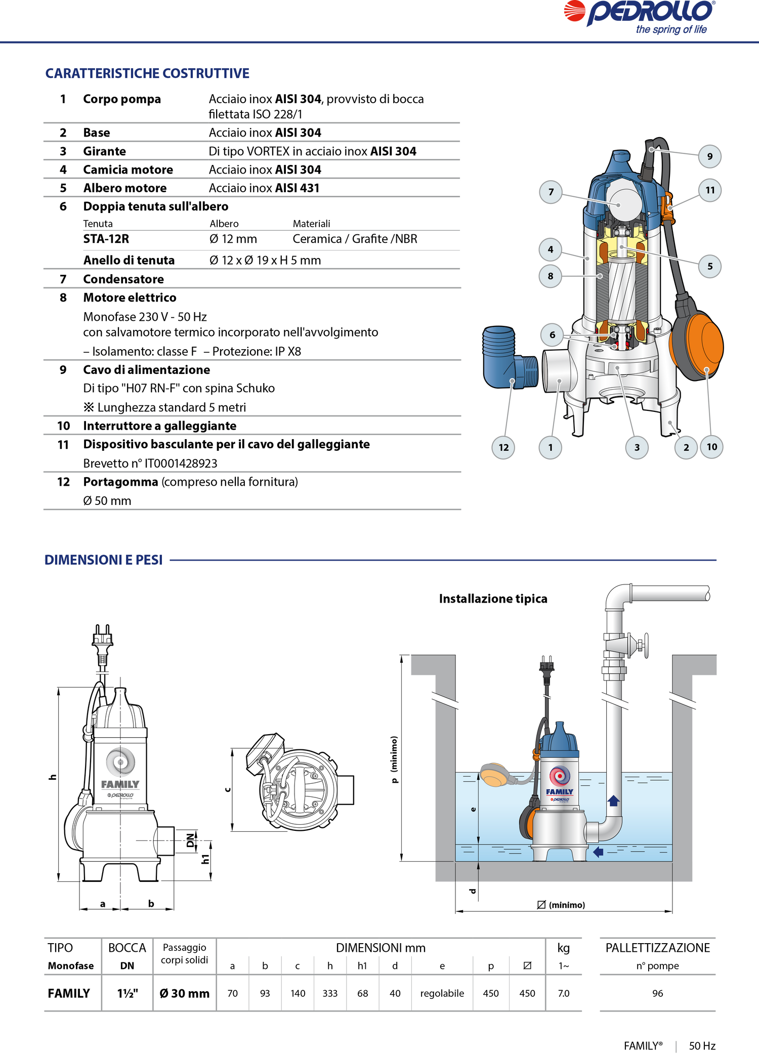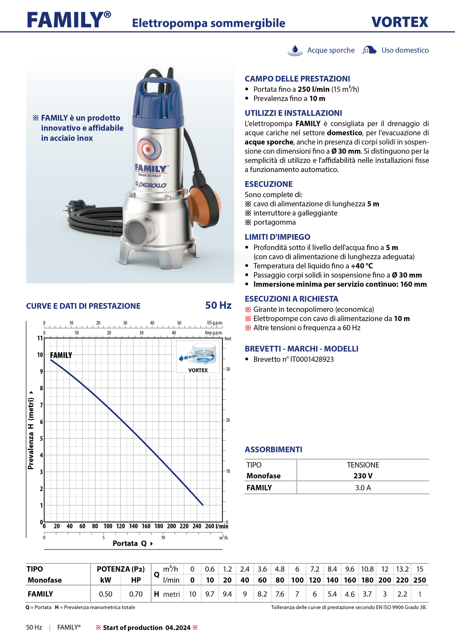 L'elettropompa FAMILY è consigliata per il drenaggio di acque cariche nel settore domestico, per l'evacuazione di acque sporche, anche in presenza di corpi solidi in sospensione con dimensioni fino a Ø 30 mm. Si distinguono per la semplicità di utilizzo e l'affidabilità nelle installazioni fisse a funzionamento automatico.
