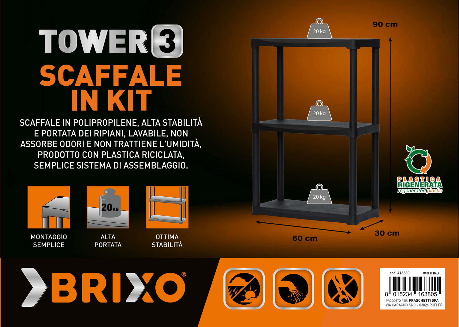 Scaffale in polipropilene, alta stabilità e portata dei ripiani ( 20kg a ripiano ) , lavabile non assorbe odori e non trattiene l'umidità. Prodotto con plastica riciclabile, semplice sistema di assemblaggio.