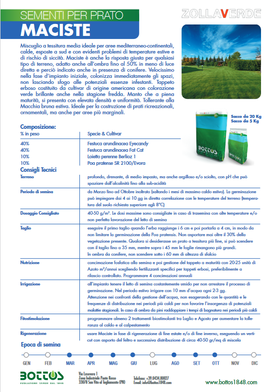 Miscuglio a tessitura media ideale per aree mediterraneo-continentali,calde, esposte a sud e con evidenti problemi di temperature estive edi rischio di siccità. Maciste è anche la risposta giusta per qualsiasitipo di terreno, adatto anche all’ombra fino al 50% in meno di lucediretta e perciò indicato anche in presenza di conifere. Velocissimonella fase d’impianto iniziale, colonizza immediatamente gli spazi,non lasciando sfogo alle potenziali essenze infestanti. Tappetoerboso costituito da cultivar di origine americana con colorazioneverde brillante anche nella stagione fredda. Manto che a pienamaturità, si presenta con elevata densità e uniformità. Tollerante allaMacchia bruna estiva. Ideale per la costruzione di prati ricreazionali,ornamentali,...