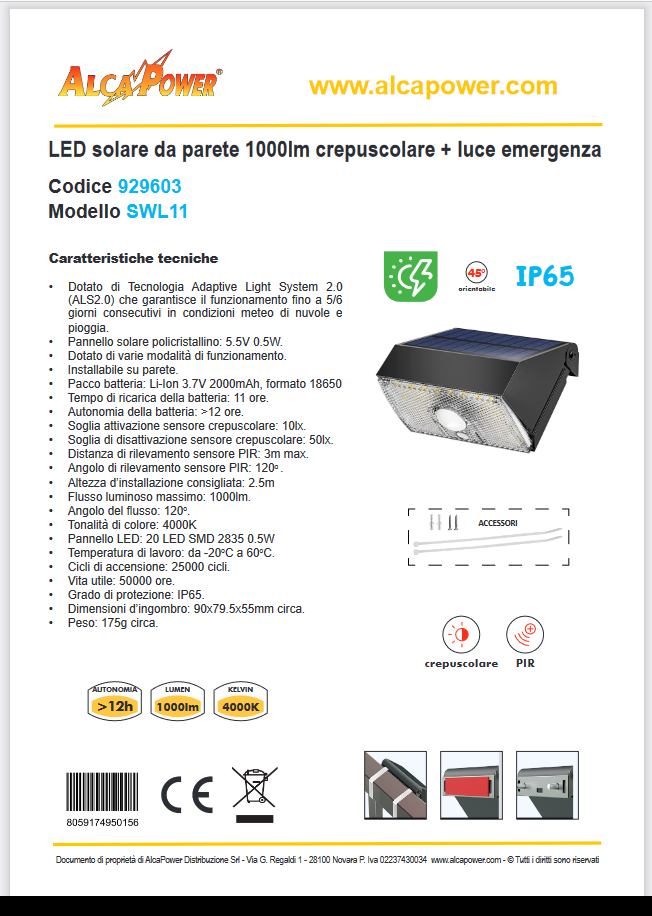 - Soglia attivazione sensore crepuscolare: 10lux.