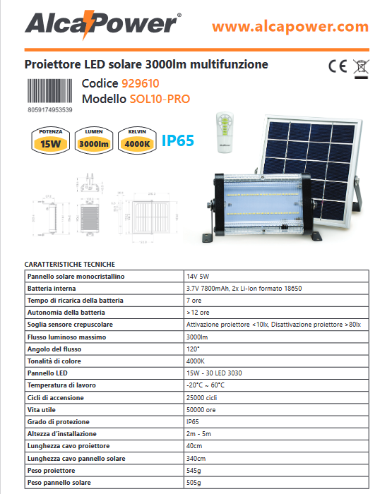 Proiettore solare 3000lm multifunzione+telecomando - SOL10-PRO