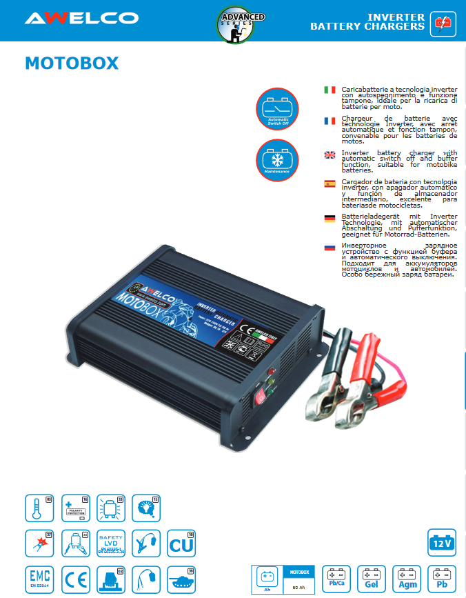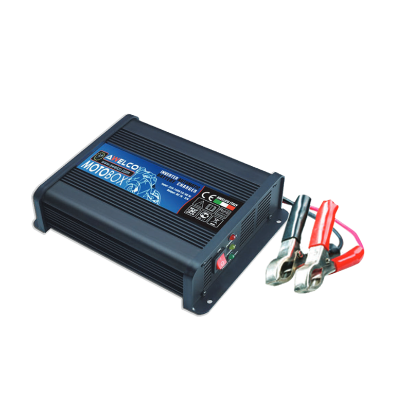CARICABATTERIA MOTOBOX 4A Caricabatterie a tecnologia inverter con autospegnimento e funzione tampone, ideale per la ricarica di batterie per moto. Utilizza 230/240 V – 50/60hz Corrente di uscita: 12 V, 4000 mA – Carico di 17 a 80 Ah. Protezioni contro le Inversione di polarità Garanzia 2 anni – SAV Per motociclette Quad e veicoli leggeri