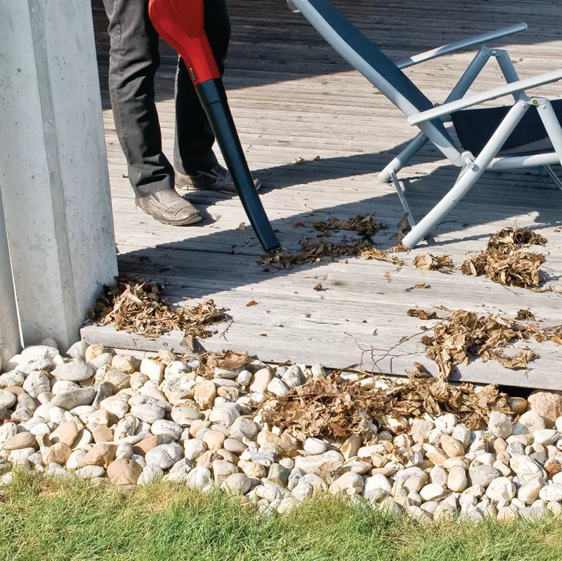 Il soffiatore per foglie a batteria GC-CL 18 Li E Kit è un apparecchio potente e affidabile che consente una pulizia rapida e comoda di terreni e angoli. Con il nuovo sistema di batteria Power X-Change di Einhell, il soffiatore per foglie è dotato di una batteria da 18 V 2,0 Ah per interventi di lavoro di lunga durata. Il soffiatore per foglie GC-CL 18 Li E Kit è dotato di un indicatore di carica batteria con tre LED che permette di verificare istantaneamente lo stato di carica attuale. Le batterie possono essere utilizzate per tutti gli apparecchi della famiglia Power X-Change. Un caricabatteria rapido aggiuntivo fa parte della dotazione. Le dimensioni maneggevoli e il peso minimo contribuiscono a un maggior comfort di lavoro senza la necessità di corrente elettrica. Con la regolazione elettronica della velocità, la potenza di soffiaggio può essere calibrata in modo preciso a seconda della necessità. Grazie alla presa antiscivolo (softgrip), l'uso dello soffiatore per foglie a batteria risulta particolarmente confortevole e sicuro.