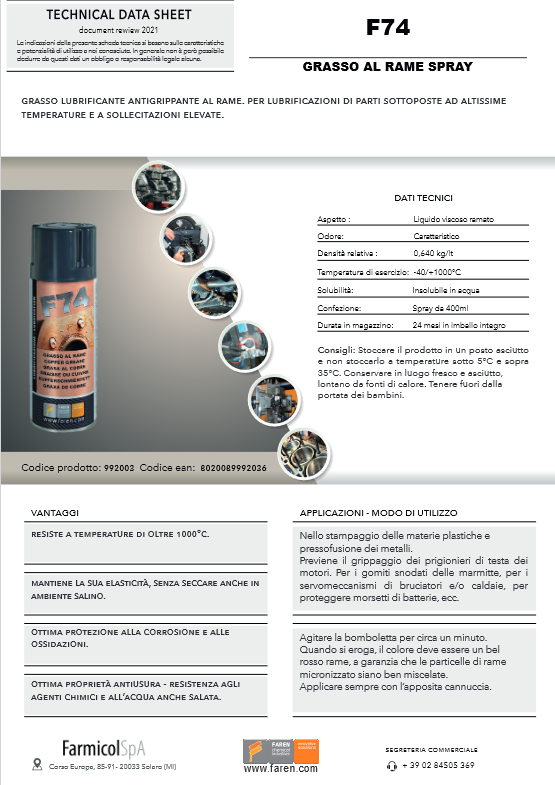 FAREN F 74 BOMBOLETTA SPRAY GRASSO AL RAME ML. 400 GRASSO LUBRIFICANTE ANTIGRIPPANTE AL RAME. PER LUBRIFICAZIONI DI PARTI SOTTOPOSTE AD ALTISSIME TEMPERATURE E A SOLLECITAZIONI ELEVATE. Aspetto : Liquido viscoso ramato Solubilità: Insolubile in acqua Confezione: Spray da 400ml Temperatura di esercizio: -40/+1000°C Densità relativa : 0,640 kg/lt Odore: Caratteristico Consigli: Stoccare il prodotto in un posto asciuttoe non stoccarlo a temperature sotto 5°C e sopra 35°C. Conservare in luogo fresco e asciutto, lontano da fonti di calore. Tenere fuori dalla portata dei bambini. VANTAGGI RESISTE A TEMPERATURE DI OLTRE 1000°C. MANTIENE LA SUA ELASTICITÀ, SENZA SECCARE ANCHE IN AMBIENTE SALINO. OTTIMA PROTEZIONE ALLA CORROSIONE E ALLE OSSIDAZIONI. OTTIMA PROPRIETÀ ANTIUSURA - RESISTENZA AGLI AGENTI CHIMICI E ALL’ACQUA ANCHE SALATA. APPLICAZIONI - MODO DI UTILIZZO Nello stampaggio delle materie plastiche e pressofusione dei metalli. Previene il grippaggio dei prigionieri di testa dei motori. Per i gomiti snodati delle marmitte, per i servomeccanismi di bruciatori e/o caldaie, per proteggere morsetti di batterie, ecc. Agitare la bomboletta per circa un minuto. Quando si eroga, il colore deve essere un bel rosso rame, a garanzia che le particelle di rame micronizzato siano ben miscelate. Applicare sempre con l’apposita cannuccia.
