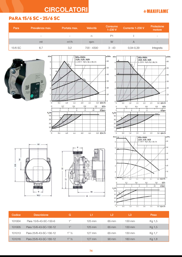 Modello PARA 25/6-43-SC-130-12 Filettatura raccordi : 1''1/2 Interasse : 130mm  I circolatori WILO sono quanto di meglio il mercato propone nel settore del riscaldamento e condizionamento nell'ambito civile ed industriale. Manuale d'uso disponibile qui