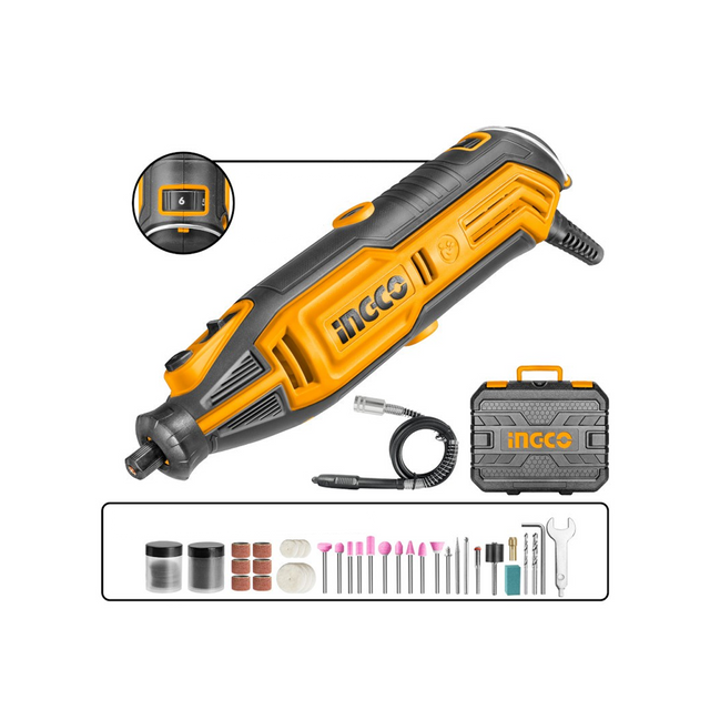 Mini smerigliatrice angolare 130w C/Flessibile  + accessori Tensione 220-240V ~ 50/60HzPotenza in ingresso 130 WVelocità a vuoto 10000-35000 giri/minDimensioni della pinza 3,2 mm/2,3 mmControllo della velocità variabileAccessori Con 1 albero flessibileCon accessori da 109 pezziCon 1 set di spazzole dicarbone extraImballo da BMC